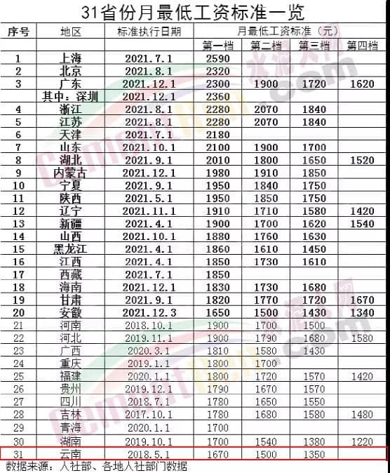 ?從上述數(shù)據(jù)可見,云南區(qū)域最低工資標(biāo)準(zhǔn)位于全國31省市自治區(qū)最低工資標(biāo)準(zhǔn)的最后一位。