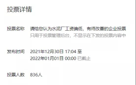 2021年最后一天,水泥人網(wǎng)發(fā)起了全網(wǎng)民調(diào),結(jié)果顯示有15%的網(wǎng)友投票海螺水泥,認為企業(yè)工資偏低,有待改善。