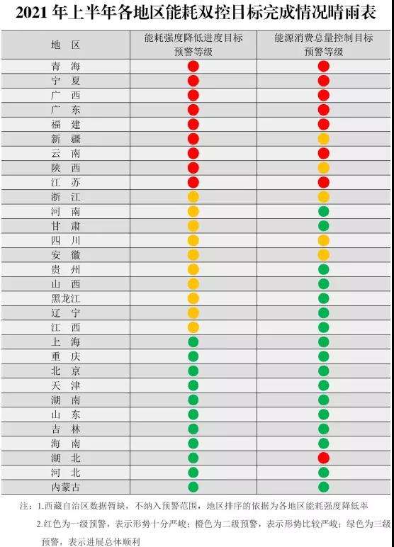 國家發(fā)展改革委印發(fā)《2021年上半年各地區(qū)能耗雙控目標完成情況晴雨表》。青海、寧夏、廣西、廣東、福建、新疆、云南、陜西、江蘇、浙江、安徽、四川等12個地區(qū)在能耗降低和能源消費總量方面均呈現(xiàn)嚴峻態(tài)勢。全國有一半以上的省份,上半年“雙控”目標都沒完成,多區(qū)域采取最嚴格的限產(chǎn)、限電措施。