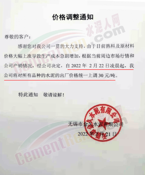 日前 ,無(wú)錫市金久水泥有限公司通知,由于目前熟料原材料價(jià)格大幅上漲導(dǎo)致生產(chǎn)成本急劇增加,根據(jù)當(dāng)前周邊市場(chǎng)行情和公司產(chǎn)銷情況,經(jīng)公司決定自2月22日凌晨起,公司將對(duì)所有品種的水泥出廠價(jià)統(tǒng)一上調(diào)30元/噸。