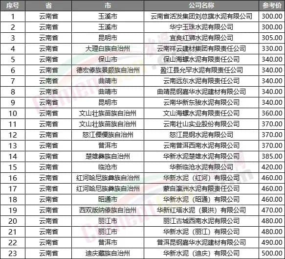 另一相對(duì)低價(jià)的區(qū)域是云南省,水泥人網(wǎng)重點(diǎn)監(jiān)控的23家企業(yè)中14家企業(yè)報(bào)價(jià)在400元/噸以下,8家企業(yè)報(bào)價(jià)在500元/噸以下,僅華新水泥(迪慶)有限公司報(bào)價(jià)500元/噸。