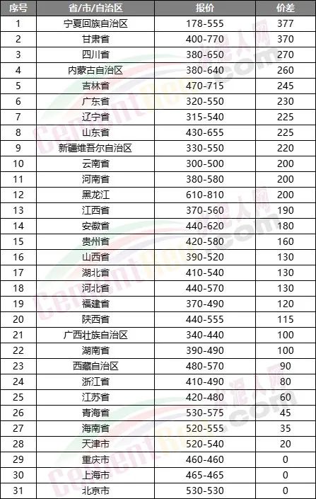 從同一省市自治區(qū)內(nèi)高低差價(jià)來(lái)入看,寧夏回族自治區(qū)、甘肅、四川、內(nèi)蒙自治區(qū)、吉林 、廣東、遼寧、山東 、新疆、云南、河南、黑龍江等區(qū)域差價(jià)均在200元/噸以及上區(qū)間。相鄰區(qū)域較大差價(jià)的存在或是“價(jià)格戰(zhàn)”導(dǎo)火索的誘因。