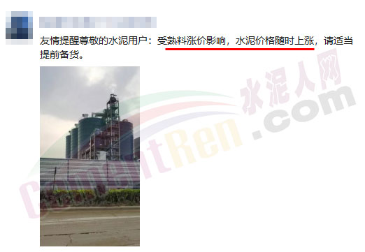 日前,長三角區(qū)域一貿(mào)易商發(fā)消息提醒用戶,受熟料漲價影響,水泥價格隨時上漲,請適當(dāng)提前備貨。
