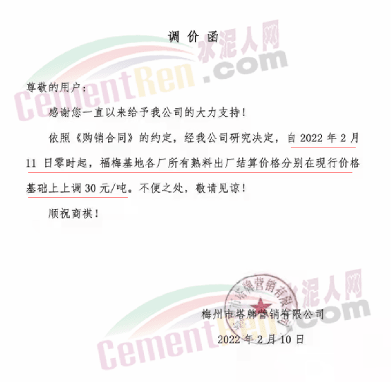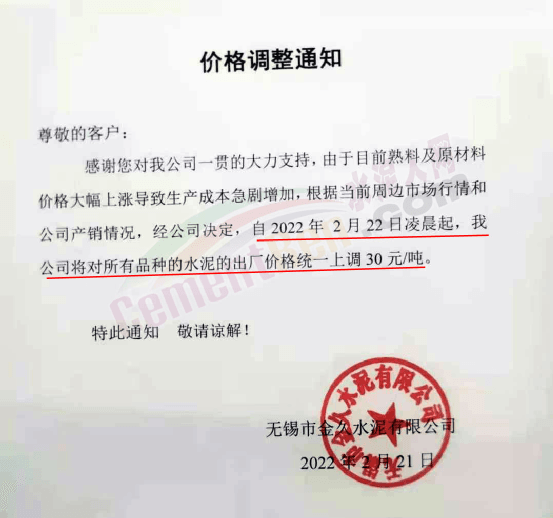 2月22日,江蘇無錫金久水泥通知上調(diào)水泥價格30元/噸。