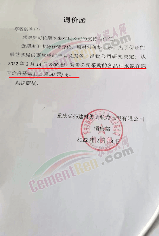 2月14日前后重慶部分企業(yè)水泥價格上調(diào)50元/噸。