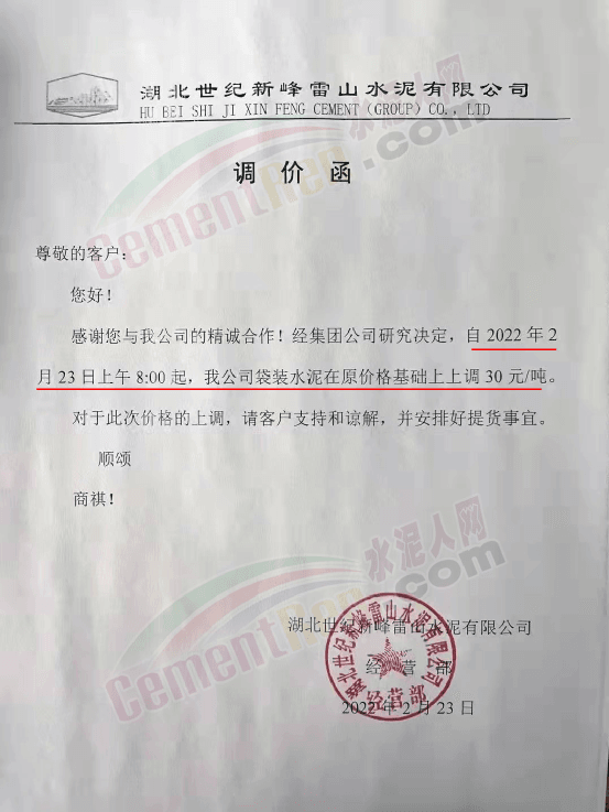 湖北世紀(jì)新峰雷山水泥有限公司通知,2月23日上午8時起,公司袋裝水泥在原價基礎(chǔ)上上調(diào)30元/噸。