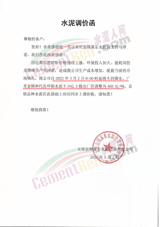 水泥人網(wǎng)通訊員消息:日前,太原金隅冀東水泥經(jīng)貿(mào)有限公司通知,因近期原燃材料價(jià)格持續(xù)上漲、環(huán)保投入加大、能耗雙控及錯(cuò)峰生產(chǎn)等因素,造成公司生產(chǎn)成本增加。根據(jù)當(dāng)前的市場(chǎng)情況,公司自2022年3月2日8時(shí)起將大同冀東、廣靈金隅和代縣環(huán)保水泥P.O42.5散出廠價(jià)調(diào)整為460元/噸,其他品種水泥在此基礎(chǔ)上對(duì)應(yīng)同步上調(diào)價(jià)格。