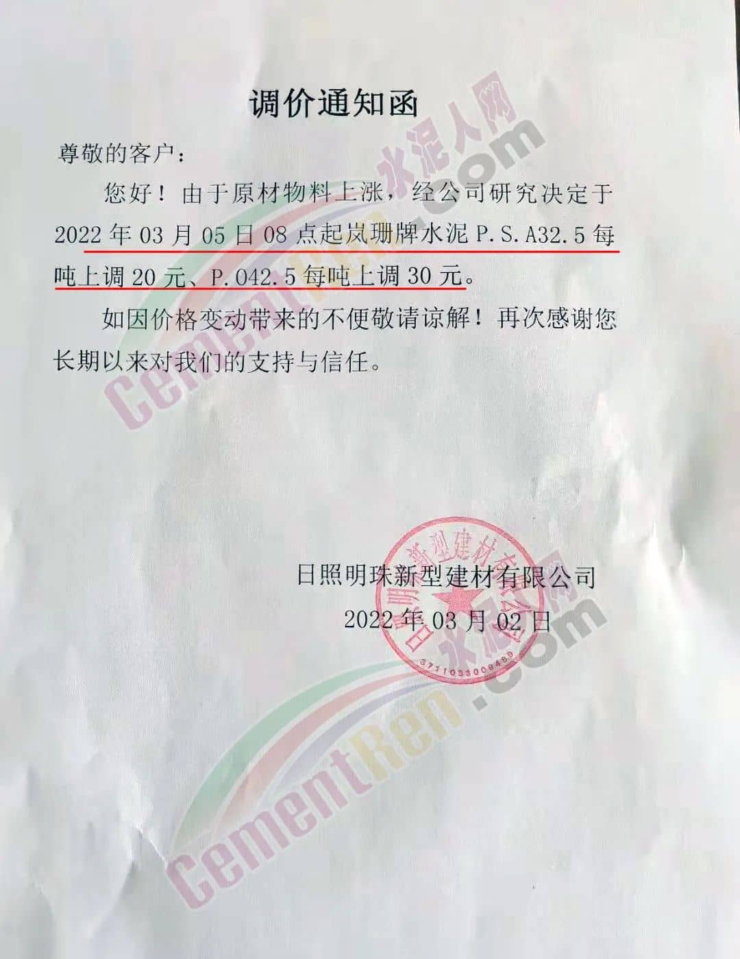 同日,山東日照明珠新型建材有限公司通知,由于原材物料上漲,經(jīng)公司研究決定于2022年3月5日8時(shí)起嵐珊牌水泥P.S.A32.5每噸上調(diào)20元、P.O42.5每噸上調(diào)30元。