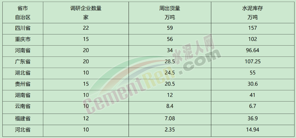 部分省市自治區(qū)水泥出貨量及庫存量一覽