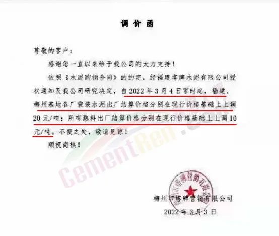 梅州市梅縣區(qū)金輝建材有限公司通知,根據(jù)市場情況,經(jīng)公司研究決定,自2022年3月4日零時起,各品種水泥在現(xiàn)有結(jié)算價格基礎(chǔ)上上調(diào)20元/噸。