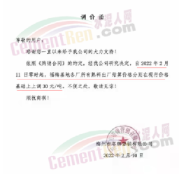 梅州皇馬水泥有限公司通知,根據(jù)目前市場實際情況,公司研究決定,自2022年3月4日零時起所有袋裝(含32.5等級散裝)水泥出廠價格分別上調(diào) 20元/噸,熟料出廠價格上調(diào)10元/噸。