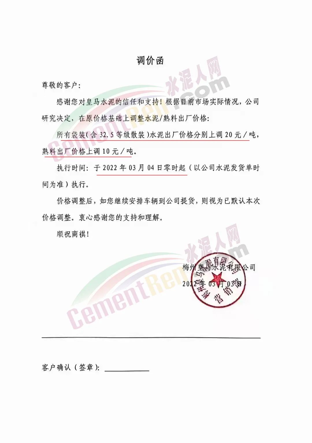 梅州寧江水泥有限公司銷售部通知,經(jīng)公司研究決定并授權(quán)銷售部發(fā)出通知,從2022年3月4日零時起,本公司生產(chǎn)的所有袋裝水泥,出廠價格在現(xiàn)行價格基礎(chǔ)上上調(diào)20元/噸。