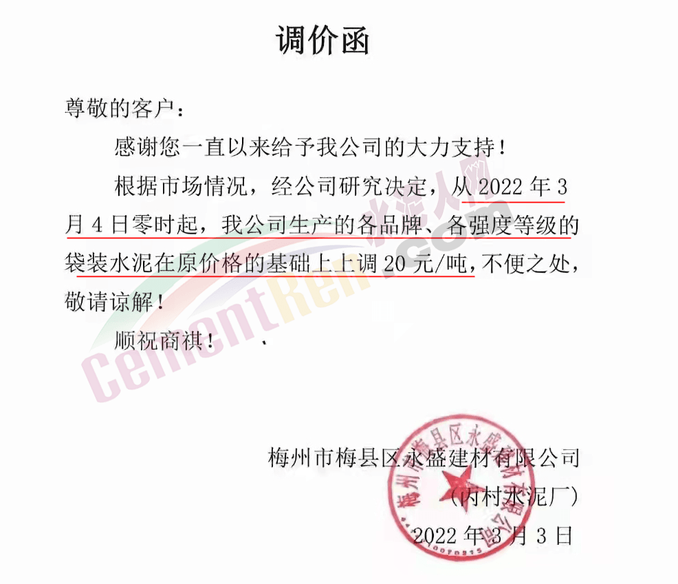 梅州市梅縣區(qū)永盛建材有限公司通知,從2022年3月4日零時起,公司生產(chǎn)的各品牌、各強度等級的袋裝水泥在原價格的基礎(chǔ)上上調(diào)20元/噸。