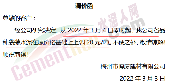 梅州市博廈建材有限公司通知從2022年3月4日零時起,公司各品種袋裝水泥在原價格基礎(chǔ)上上調(diào)20元/噸。