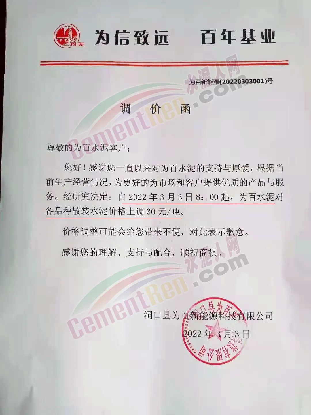 湖南省邵陽市洞口縣為百新能源料技有限公司通知,根據(jù)當前生產(chǎn)經(jīng)營情況,為更好的為市場和客戶提供優(yōu)質(zhì)的產(chǎn)品與服務(wù)。經(jīng)研究決定自 2022年3月3日8時起,為百水泥對各品種散裝水泥價格上調(diào)30元/噸。