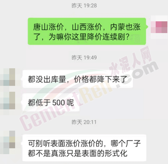 保定區(qū)域一建材貿(mào)易商對水泥人網(wǎng)表示,目前河北保定區(qū)域多數(shù)企業(yè)都沒有出庫量,價格都降下來了,P.O42.5散裝水泥報價多在500元/噸以下。“可別聽表面上漲價的,那些都不是真漲,只是表面的形式化”。上述貿(mào)易商對水泥人網(wǎng)表示,已經(jīng)有企業(yè)開始降價了,啥時候能止跌還不確定,但是降價很有可能“拍成連續(xù)劇”。