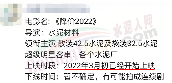 江西贛州海螺水泥經(jīng)銷商發(fā)通知稱,接贛州海螺水泥廠家通知,從2022 年3月3日上午8時起,公司銷售信豐、南康、贛州區(qū)域袋裝、散裝32.5水泥在原價格基礎(chǔ)上下調(diào)20元/噸;42.5散、袋裝水泥在原價格基礎(chǔ)上下調(diào)40元/噸。