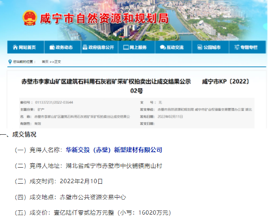 2月10日前后華新水泥控股企業(yè)華新交投(赤壁)新型建材有限公司以16020萬元競得赤壁市李家山礦區(qū)建筑石料用石灰?guī)r礦采礦權。該礦山資源儲量為13652.4萬噸。