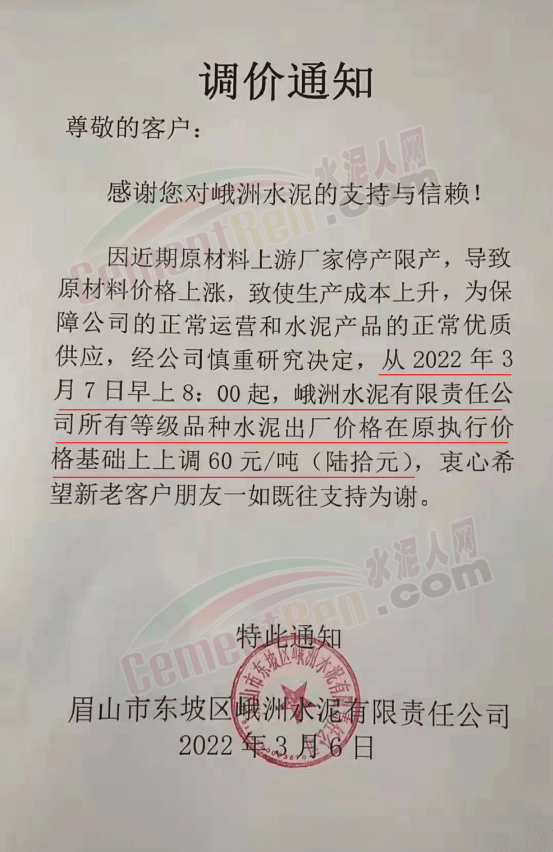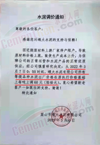 眉山市峨大水泥有限公司通知因近期原材料上游廠家停產(chǎn)限產(chǎn),導致原材料價格上漲,致使生產(chǎn)成本上升,為保證公司的正常運營和水泥產(chǎn)品的正常優(yōu)質(zhì)供應,經(jīng)公司慎重研究決定從2022年3月7日0時起峨大水泥有限公司所有等級品種水泥出廠價格在原執(zhí)行價格基礎(chǔ)上上調(diào)60元/噸。