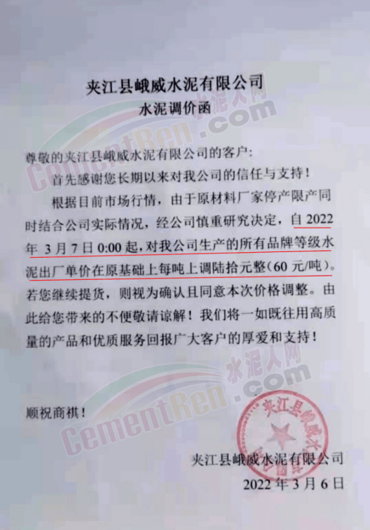 夾江縣峨威水泥有限公司通知,根據(jù)目前市場行情,由于原材料廠家停產(chǎn)限產(chǎn),結(jié)合公司實際情況,經(jīng)研究決定自2022年3月7日0時起,公司生產(chǎn)的所有品牌等級水泥出廠單價在原基礎(chǔ)上上調(diào)60元/噸。