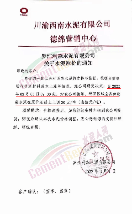 羅江利森水泥有限公司通知自2022年3月3日8時起,對公司德陽、綿陽區(qū)域全品種袋裝水泥在原價基礎(chǔ)上上調(diào)30元/噸。