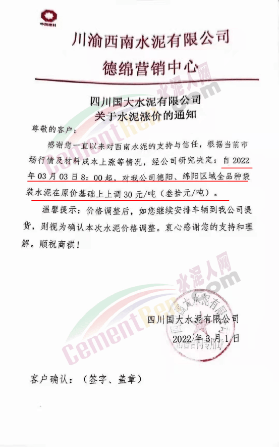 四川國大水泥有限公司通知自2022年3月3日8時起,對公司德陽、綿陽區(qū)域全品種袋裝水泥在原價基礎(chǔ)上上調(diào)30元/噸。