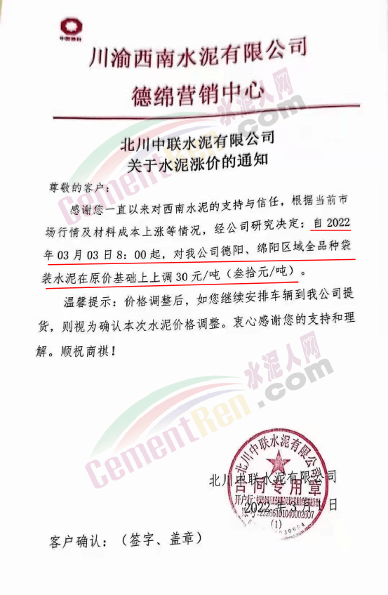 北川中聯(lián)水泥有限公司自2022年3月3日8時起,對德陽、綿陽區(qū)域全品種袋裝水泥在原價基礎(chǔ)上上調(diào)30元/噸。