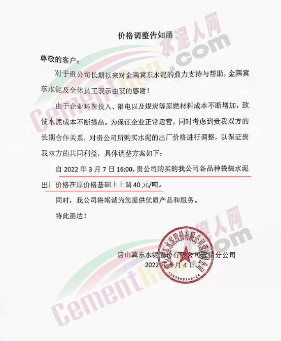 唐山冀東水泥股份有限公司營銷分公司通知,自 2022年3月7日16時起,各品種袋裝水泥出廠價格在原價格基礎(chǔ)上上調(diào)40元/噸。