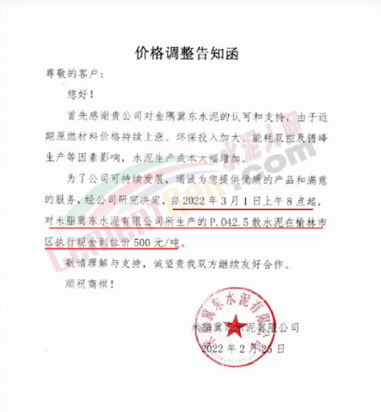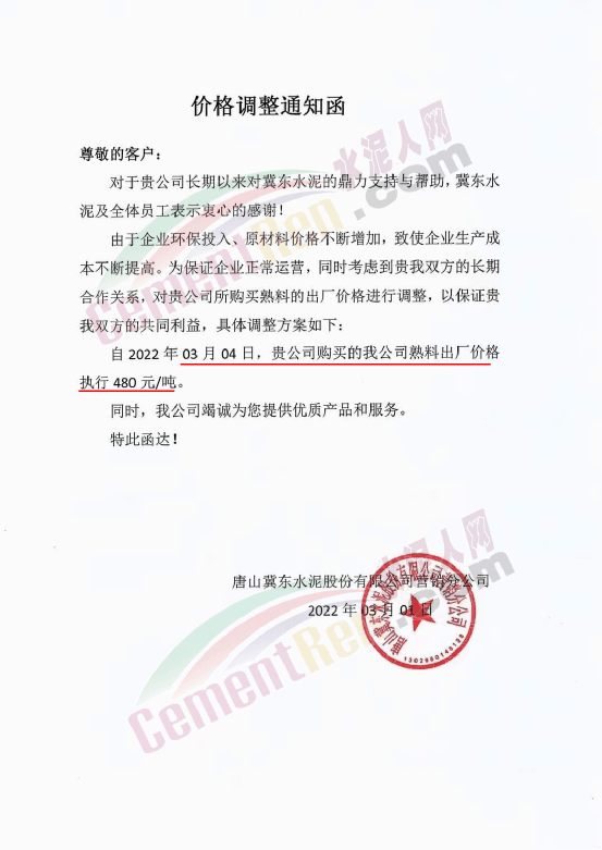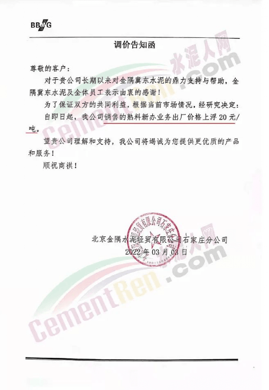 山西太原金隅冀東水泥經(jīng)貿(mào)有限公司通知,自2022年3月2日8時起將大同冀東、廣靈金隅和代縣環(huán)保水泥P.O42.5散出廠價調(diào)整為460元/噸,其他品種水泥在此基礎(chǔ)上對應同步上調(diào)價格。
