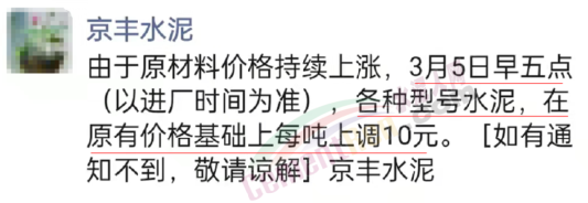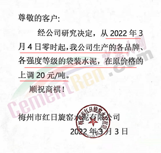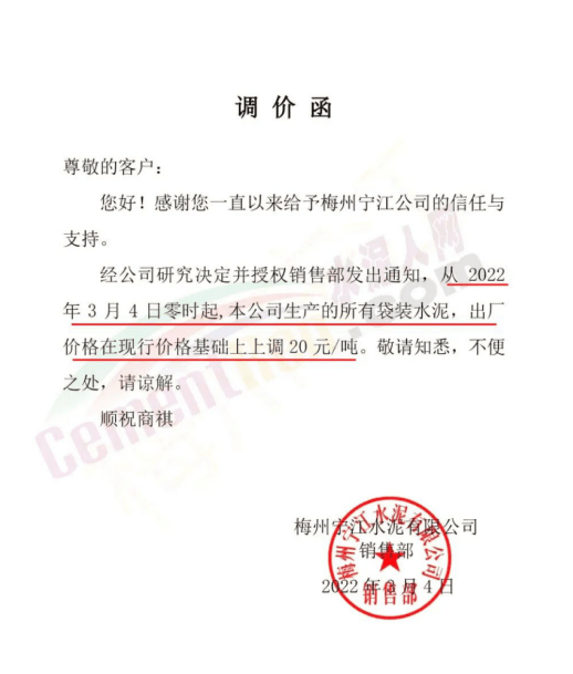 梅州寧江水泥有限公司銷售部通知,從2022年3月4日零時起,公司生產(chǎn)的所有袋裝水泥,出廠價格在現(xiàn)行價格基礎(chǔ)上上調(diào)20元/噸。