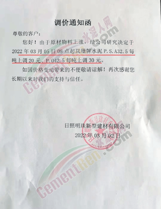 山東日照明珠新型建材有限公司通知,2022年3月5日8時起嵐珊牌水泥P.S.A32.5每噸上調(diào)20元、P.O42.5每噸上調(diào)30元。