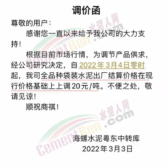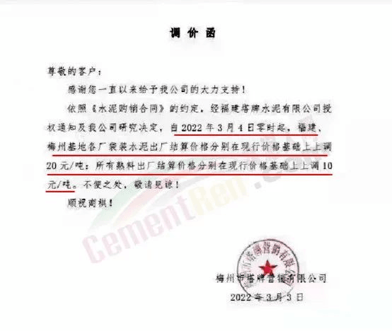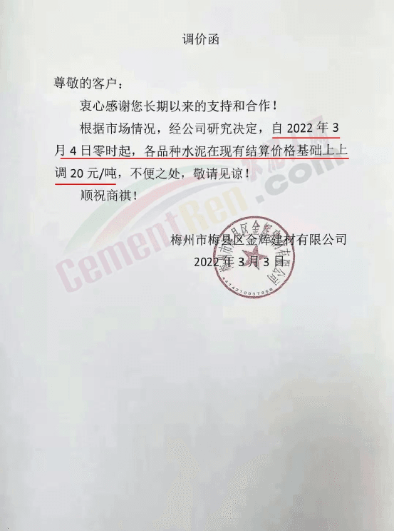 梅州市梅縣區(qū)金輝建材有限公司通知,自2022年3月4日零時起,各品種水泥在現(xiàn)有結(jié)算價格基礎(chǔ)上上調(diào)20元/噸。