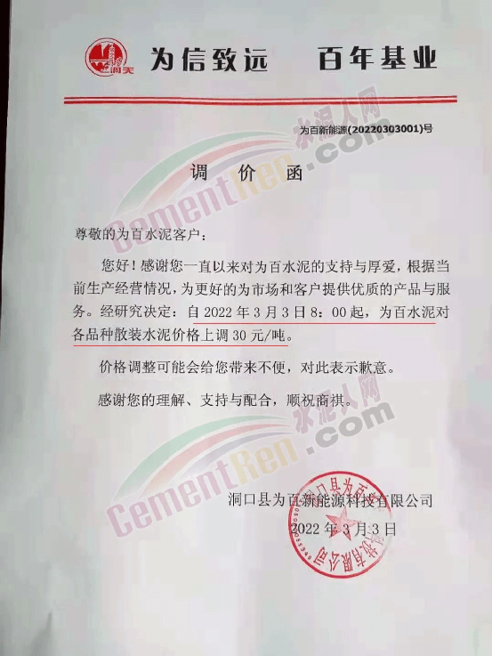 ?湖南省邵陽市洞口縣為百新能源料技有限公司通知,自 2022年3月3日8時起,為百水泥對各品種散裝水泥價格上調(diào)30元/噸。