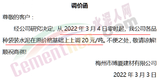 梅州市博廈建材有限公司通知從2022年3月4日零時起,公司各品種袋裝水泥在原價格基礎(chǔ)上上調(diào)20元/噸。