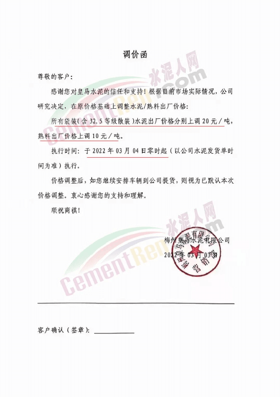 梅州皇馬水泥有限公司通知,自2022年3月4日零時起所有袋裝(含32.5等級散裝)水泥出廠價格分別上調(diào) 20元/噸,熟料出廠價格上調(diào)10元/噸。