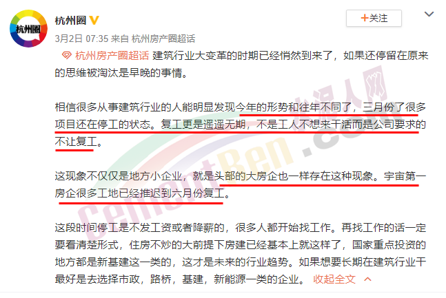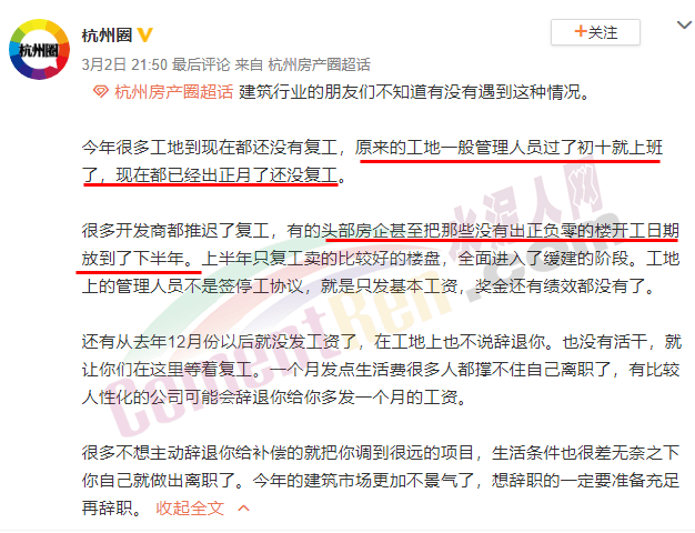 近期,有網(wǎng)友在社交媒體杭州房產(chǎn)圈超話欄目發(fā)起關(guān)于建筑行業(yè)的討論稱,很多工地到現(xiàn)在都還沒有復(fù)工,原來的工地一般管理人員過了初十就上班了,現(xiàn)在都已經(jīng)出正月了還沒復(fù)工。