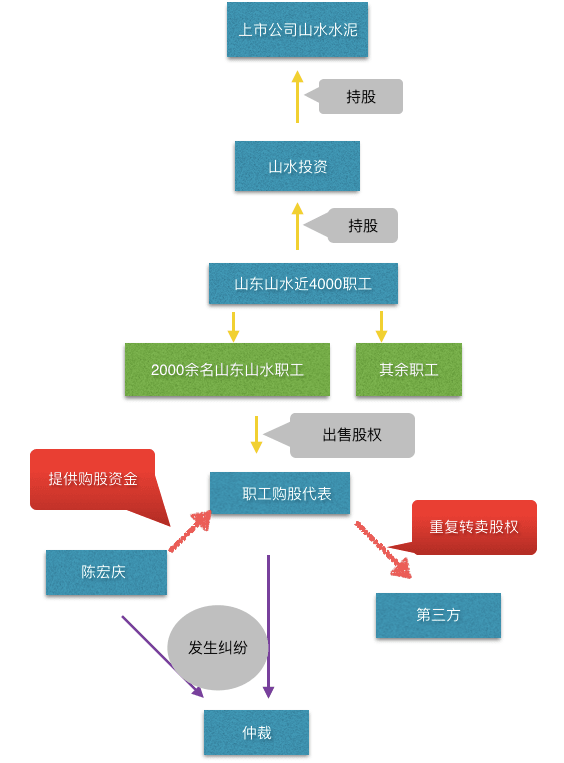 話分兩頭說,2013年,山水水泥高管內(nèi)斗爆發(fā)后。不少高管和職工此后謀求股權(quán)變現(xiàn),于是找到了河南汝州商人陳宏慶。2015年,陳宏慶開始收購山水水泥職工股東的持有股權(quán),但他并未直接與職工股東完成交易,而是在部分高管的協(xié)助下,以付元偉、劉德權(quán)、郝廣祥等11名職工購股代表的名義收購職工股份。