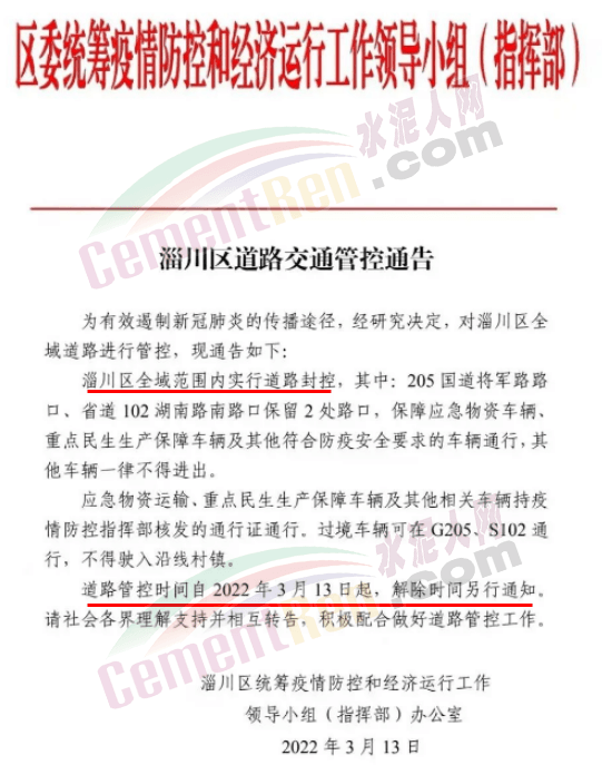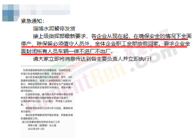 水泥人網(wǎng)通訊員消息,受不可抗力影響,上海部分區(qū)域水泥中轉(zhuǎn)庫暫停發(fā),預計這種情況將持續(xù)2-3天。同日,山東淄博企業(yè)通知稱,接上級指揮部最新要求,各企業(yè)從現(xiàn)在起,在確保安全的情況下全面停產(chǎn),除保留必須值守人員外,全體企業(yè)職工全部放假回家,要求企業(yè)全面封閉所有人員車輛一律不進廠不出廠。