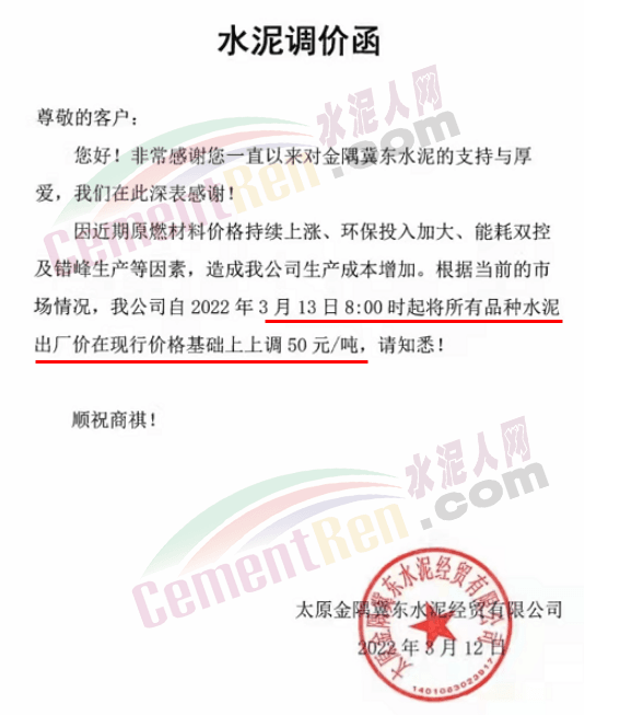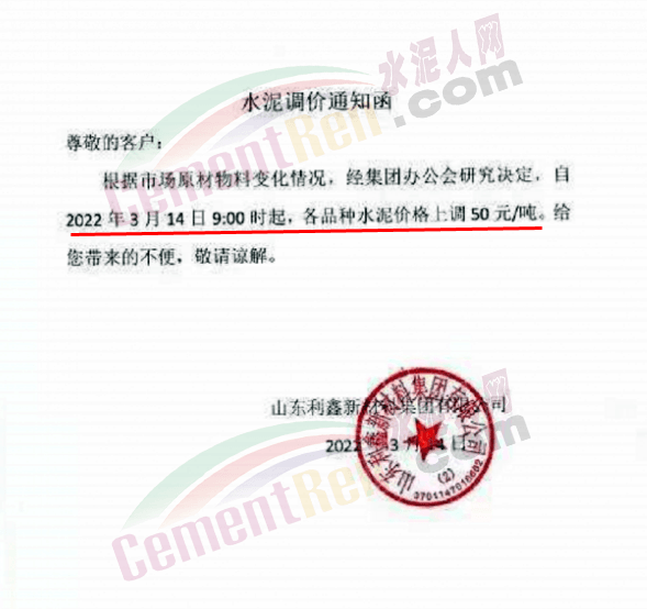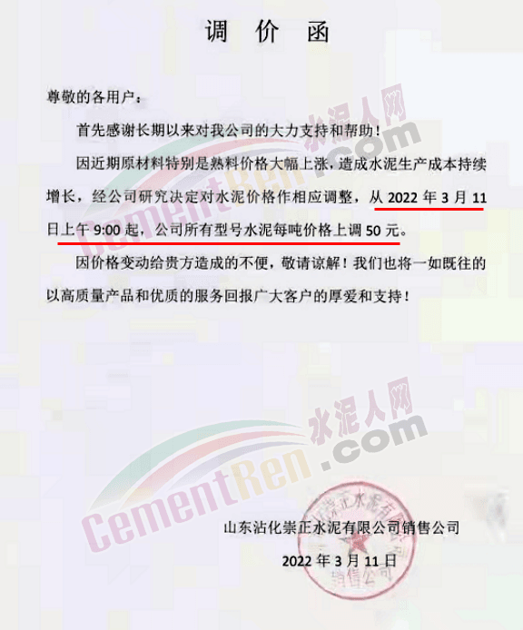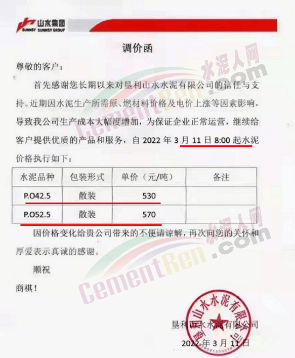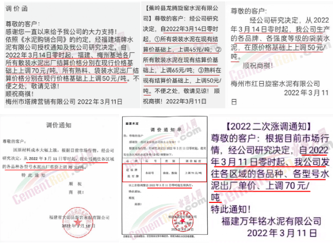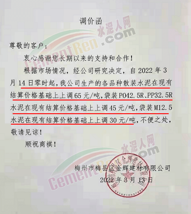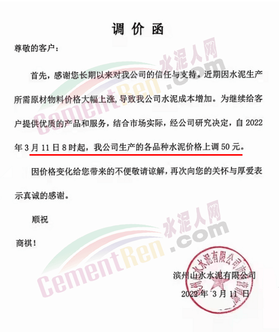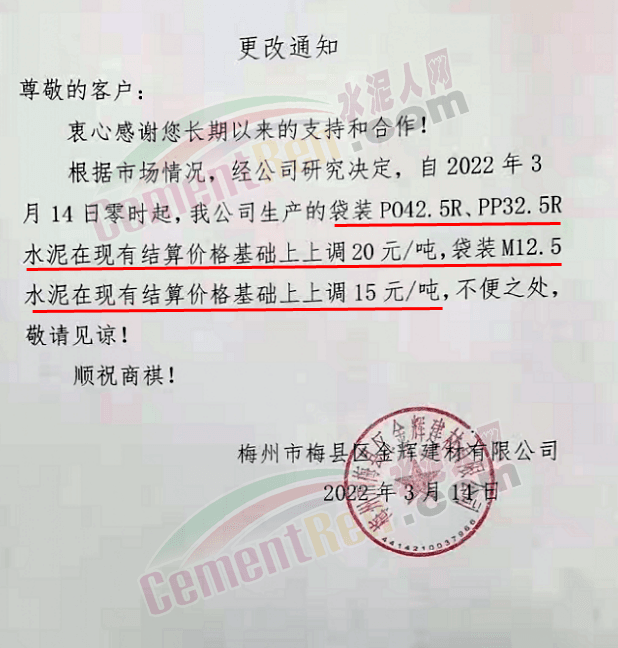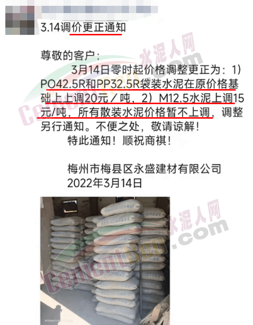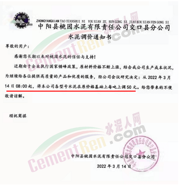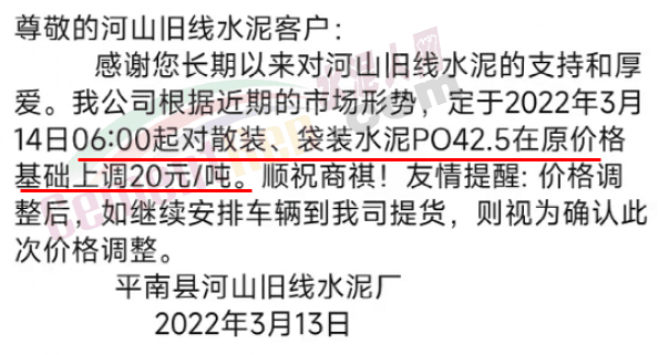 據(jù)了解,該企業(yè)3月13日時曾通知自2022年3 月14日零時起,公司生產(chǎn)的各品種散裝水泥在現(xiàn)有結(jié)算價格基礎(chǔ)上上調(diào)65元/噸,袋裝PO42.5R、PP32.5R 水泥在現(xiàn)有結(jié)算價格基礎(chǔ)上上調(diào)45元/噸,袋裝M12.5 水泥在現(xiàn)有結(jié)算價格基礎(chǔ)上上調(diào) 30元/噸。