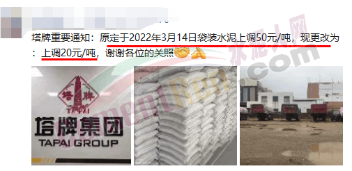 塔牌水泥通知,原定于2022年3月14日袋裝水泥上調(diào)50元/噸,現(xiàn)更改為上調(diào)20元/噸。