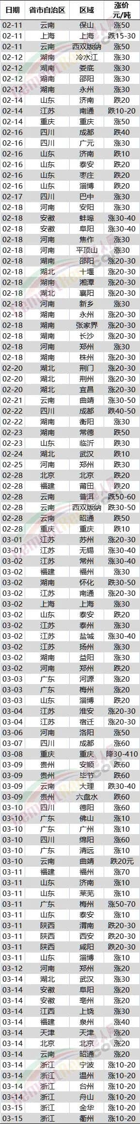 同樣波動頻繁的還有山東濟南跌30元/噸,漲10元/噸;山東泰安跌40元/噸,漲10元/噸;山東淄博跌40元/噸,漲10元/噸;江蘇南通跌10-20元/噸,漲20-30元/噸;河南鄭州漲50元/噸,跌50元/噸;云南曲靖漲30-50元/噸,跌20元/噸;云南西雙版納漲50元/噸,跌30-50元/噸……
