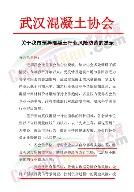 湖北武漢市混凝土協(xié)會發(fā)文給各會員單位稱,今年春節(jié)開年以來,受疫情及建筑市場節(jié)前回款乏力等多重因素的疊加影響,武漢市混凝土需求量銳減,復工復產(chǎn)率遠低于同期水平,加之行業(yè)低價競爭情況愈加激烈,而混凝土原材料價格繼續(xù)保持上漲趨勢,多重壓力使得各會員企業(yè)不堪重負。鑒于當前武漢混凝土行業(yè)面臨的種種困難,協(xié)會向各會員企業(yè)提出以下風險提示,各企業(yè)應從自身客觀實際出發(fā),綜合考慮市場供需狀況,隨時調(diào)整經(jīng)營方針策略,以適應不斷變化的行業(yè)市場形勢;揀選優(yōu)質(zhì)合作單位,依賴大數(shù)據(jù)分析合作風險,做好工程項目資信背景調(diào)查,控制供貨過程中的資金風險,梳理應收賬款,多方式解決爭議,降低墊資風險;拒絕接受部分企業(yè)的商業(yè)承兌匯票支付方式,降低自身資金風險,以免造成連帶訴訟反應。