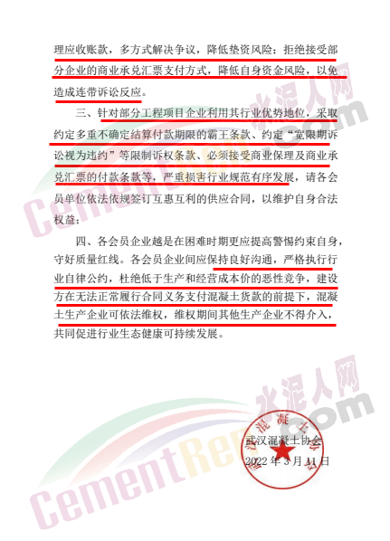 針對部分工程項目企業(yè)利用其行業(yè)優(yōu)勢地位,采取約定多重不確定結(jié)算付款期限的霸王條款、約定“寬限期訴訟視為違約”等限制訴權(quán)條款、必須接受商業(yè)保理及商業(yè)承兌匯票的付款條款等,嚴重損害行業(yè)規(guī)范有序發(fā)展,請各會員單位依法依規(guī)簽訂互惠互利的供應合同,以維護自身合法權(quán)益;各會員企業(yè)間應保持良好溝通,嚴格執(zhí)行行業(yè)自律公約,杜絕低于生產(chǎn)和經(jīng)營成本價的惡性競爭,建設(shè)方在無法正常履行合同義務(wù)支付混凝土貨款的前提下,混凝土生產(chǎn)企業(yè)可依法維權(quán),維權(quán)期間其他生產(chǎn)企業(yè)不得介入。