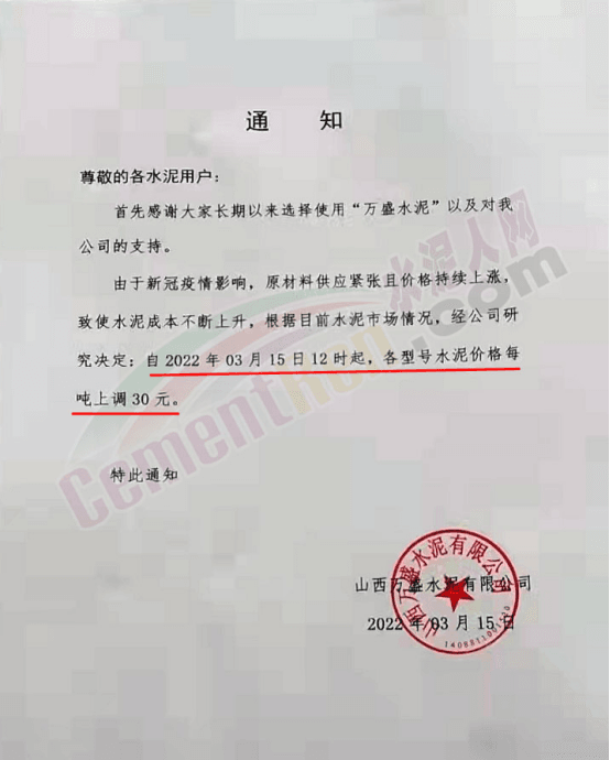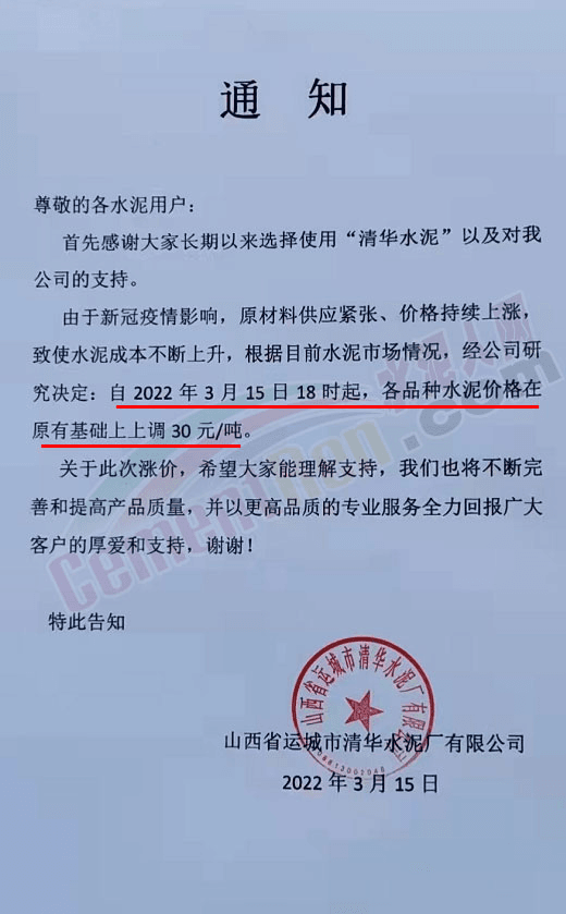 企業(yè)調(diào)價(jià)通知中提到,由于新冠疫情影響,原材料供應(yīng)緊張且價(jià)格持續(xù)上漲,疊加運(yùn)費(fèi)價(jià)格猛漲致使水泥成本不斷上升。
