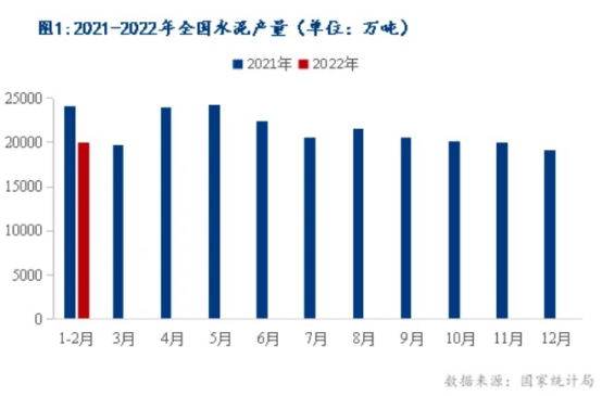 2022年1-2月,全國水泥產(chǎn)量同比大幅下降,創(chuàng)2011年以來同期次低水平,再次跌破2億噸。最新統(tǒng)計(jì)數(shù)據(jù)顯示,2022年1-2月,全國累計(jì)水泥產(chǎn)量1.99億噸,同比下降17.8%,去年同期為增長61.1%,產(chǎn)量絕對值低于去年同期4196萬噸。