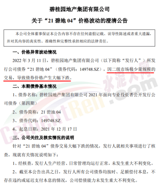 繼恒大“爆后”后,連續(xù)五年坐上房企銷冠的“宇宙第一房企”碧桂園近期也遭遇了“黑天鵝”壓頂。3月13日晚間,碧桂園公告顯示,碧桂園地產(chǎn)發(fā)行的“21碧地04”,因二級市場極少量規(guī)模的交易,導(dǎo)致債券價(jià)格產(chǎn)生大幅下跌。