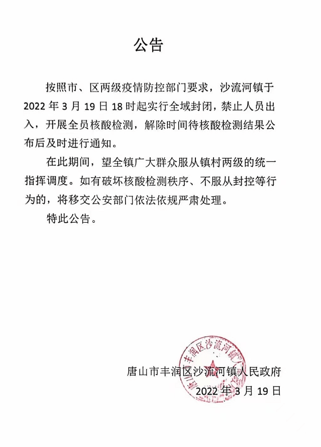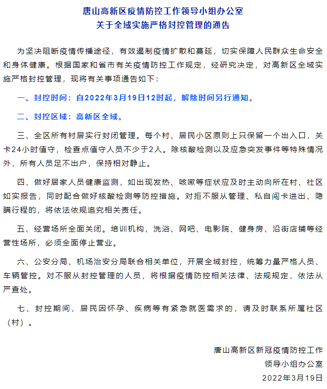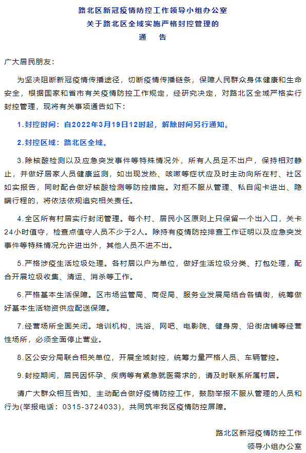 水泥重鎮(zhèn)唐山市多個(gè)區(qū)縣通知全域?qū)嵤﹪?yán)格封控管理。
