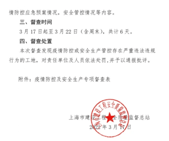 根據(jù)市住建委發(fā)布《進(jìn)一步統(tǒng)籌做好本市建設(shè)工程疫情防控和安全生產(chǎn)工作的通知》(滬建質(zhì)安〔2022〕169號)文件稱,總站即日起對本市建筑工地開展疫情防控及安全生產(chǎn)專項(xiàng)督查工作。