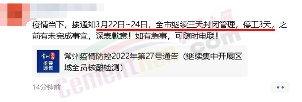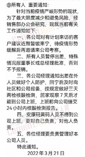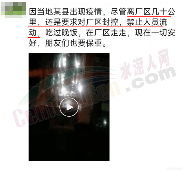 有網(wǎng)友發(fā)消息稱,因當(dāng)?shù)啬晨h出現(xiàn)疫情,距離水泥廠熟料基地幾十公里,但仍要求對廠區(qū)進(jìn)行封閉管控,禁止人員流動(dòng),不許進(jìn)出。