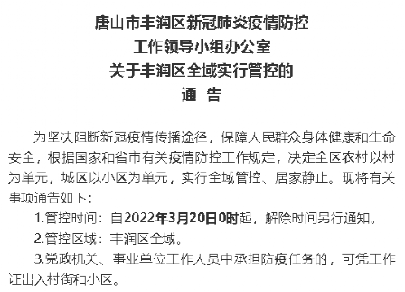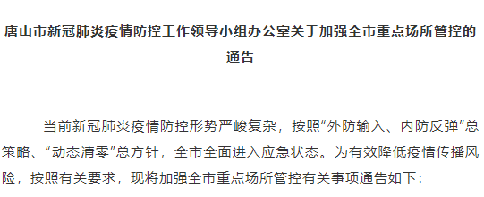 同日,唐山市新冠肺火防控工作領(lǐng)導(dǎo)小組辦公室發(fā)布加強(qiáng)全市重點(diǎn)場所管控的通告,對全市實(shí)施疫情防控臨時(shí)性交通管制。